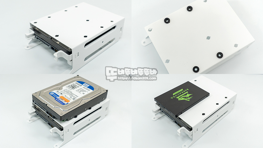케이스 하단 챔버에 HDD 베이는 HDD 2개 또는 HDD + SSD 구성으로 사용이 가능하며 HDD 장착 시 진동 방지를 위해 고무 와샤를 사용하시기 바랍니다.