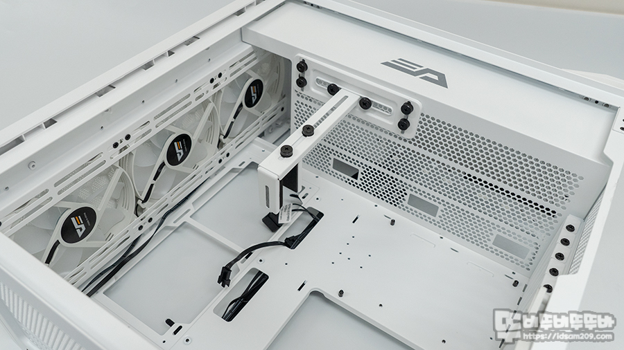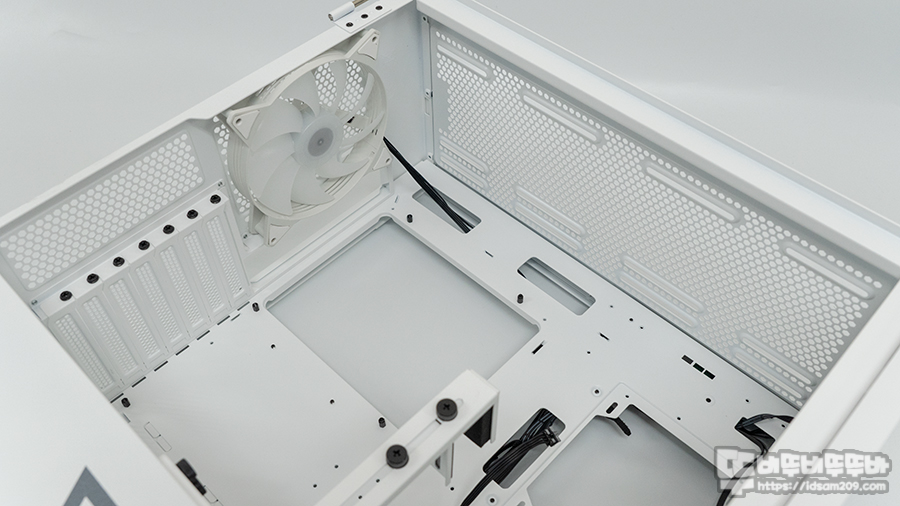 M-ATX 메인보드라 그런지 케이스의 내부 공간이 꽤 널널한 편이며 상단과 샤시 앞쪽에 쿨링팬 또는 수랭 쿨러 장착이 가능하기에 활용도가 좋게 디자인되었습니다.