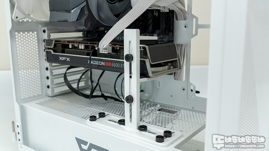 이번에 업그레이드된 다크플래쉬 DLX21 RGB MESH 튜닝 케이스의 VGA 지지대는 앞쪽으로 이용하여 그래픽카드의 끝부분을 지지하는 형태로 변경되었는데 괜찮은 선택인 거 같네요.