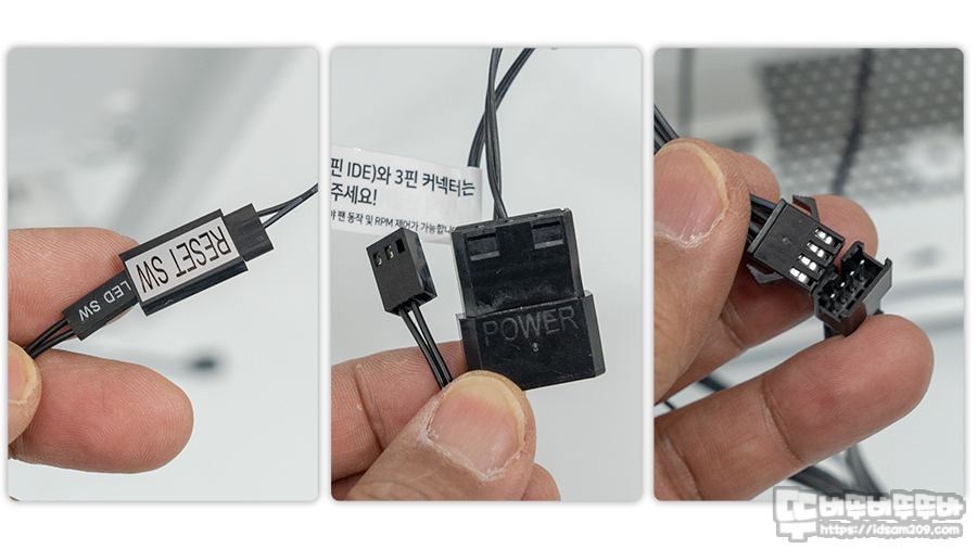 연결 커넥터 구조 중에서 쿨러 부분의 커넥터를 유심히 봐 두어야 하는데 LED 버튼과 연결된 LED SW 버튼은 RESET SW 라벨이 붙은 커넥터로 연결이 되는데 일부 모델의 경우 리셋 커넥터를 연결하는 구성에서 LED 스위치 커넥터를 연결하는 부분이니 크게 신경 쓰지 않아도 되고요.