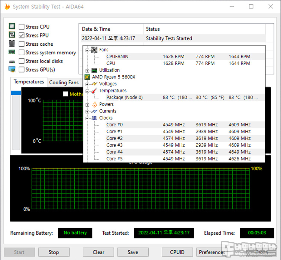 ASUS Fan Xpert4 Full Speed 기준으로 Stress FPU 5분간 테스트 시 약 83도로 부동소수점까지 연산하는 방식이기에 Stress FPU 온도가 확실히 높게 나오네요.