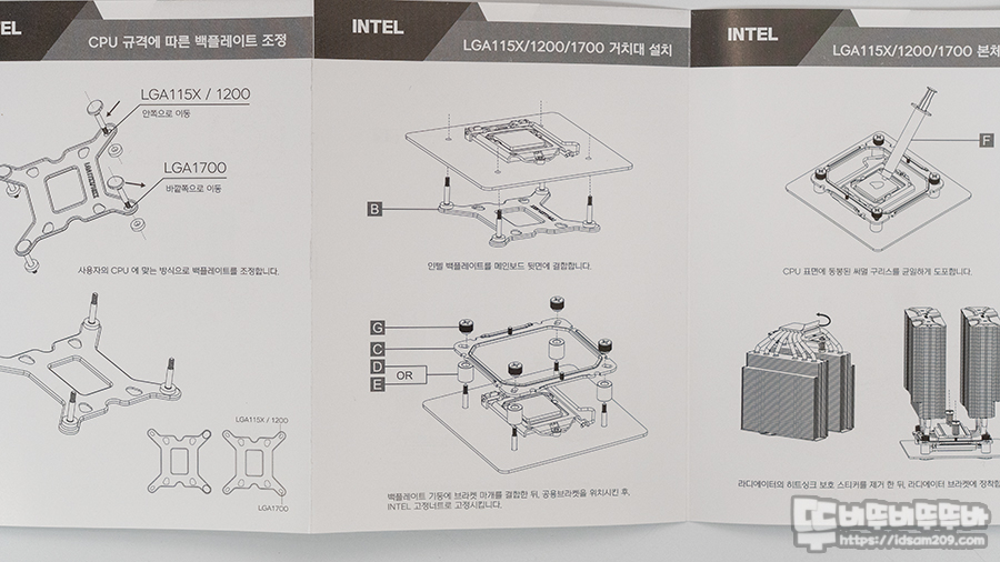 인텔의 경우 전용 백플레이트에 소켓 규격에 맞는 위치에 지지대를 연결하여 메인보드 위에 스탠드오프 및 쿨러 고정용 브라켓을 올려 너트로 고정하는 형태로 조립하게 되며 이후 CPU 표면에 써멀 구리스 도포 후 쿨러를 올려 조립하는 과정을 잘 설명하고 있습니다.
