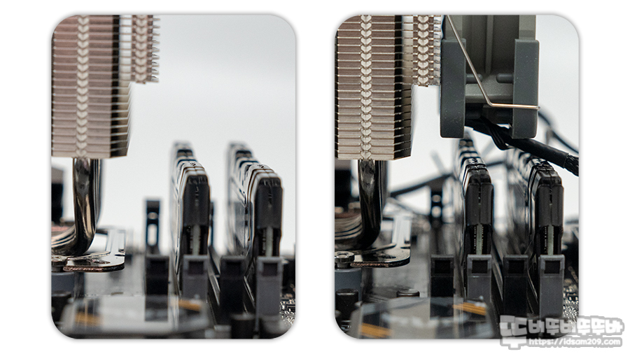 솔직히 무식하게 보이는 외형 때문에 메모리에 간섭이 있지 않을까? 했는데 히트싱크 베이스를 결합 시 메모리 뱅크 1번과 간섭이 없도록 디자인되었으니 안심하고 사용하시면 될 거 같고요.