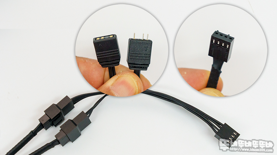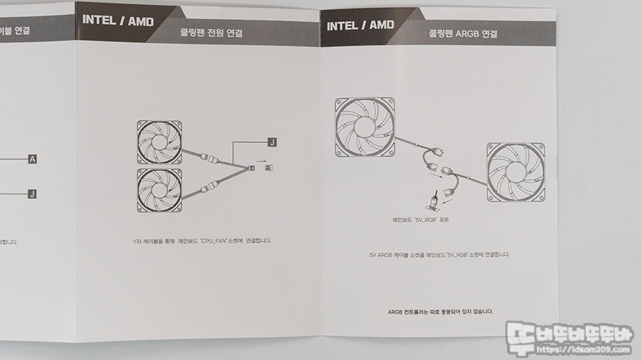 PWM 4핀과 5V ARGB 3핀 2개의 케이블이 사용되는 제품이기에 조립 시 사용자가 편리하게 정리할 수 있는 형태로 쿨러 장착이 필요하며, PWM 4핀의 경우 Y 케이블을 이용하면 하나의 PWM 커넥터로 사용할 수 있으니 참고하시기 바랍니다.