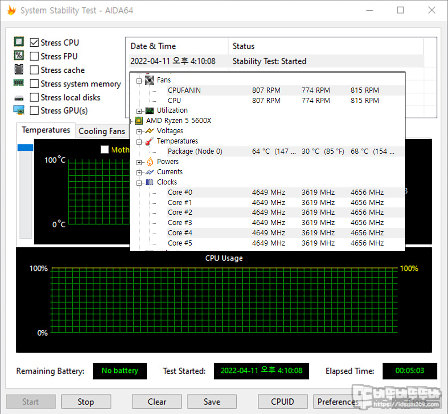기존에 이런저런 테스트를 해보아도 오픈 케이스 테스트 시 극한 성능을 보여주는 방식이 AIDA64 시스템 안정화 테스트밖에 없어 AMD 기본 쿨러와 ARCTIC Freezer A35 A-RGB AMD CPU 쿨러 장착으로 온도 차이를 확인해 보았습니다.