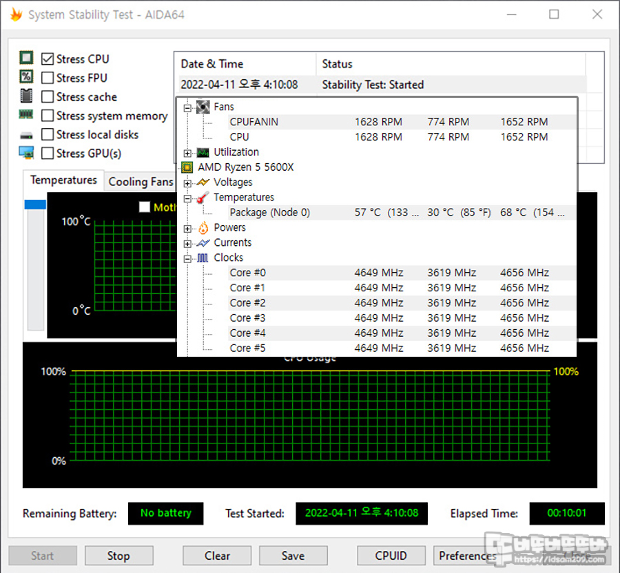 ASUS Fan Xpert4 Standard 기준으로 Stress CPU 5분간 테스트 시 약 64도, Full Speed로 5분간 테스트 시 약 57도를 유지하였습니다.