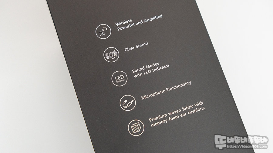 아이콘으로 설명되는 내용은 아마도 무선 방식, 사운드 모드, LED 인디케이터, 탈착형 마이크를 표현하는 거 같네요.