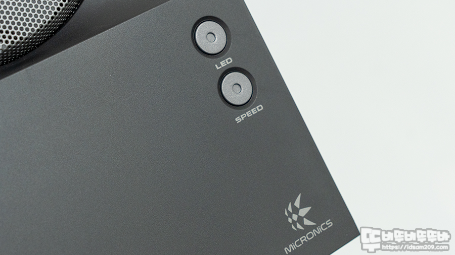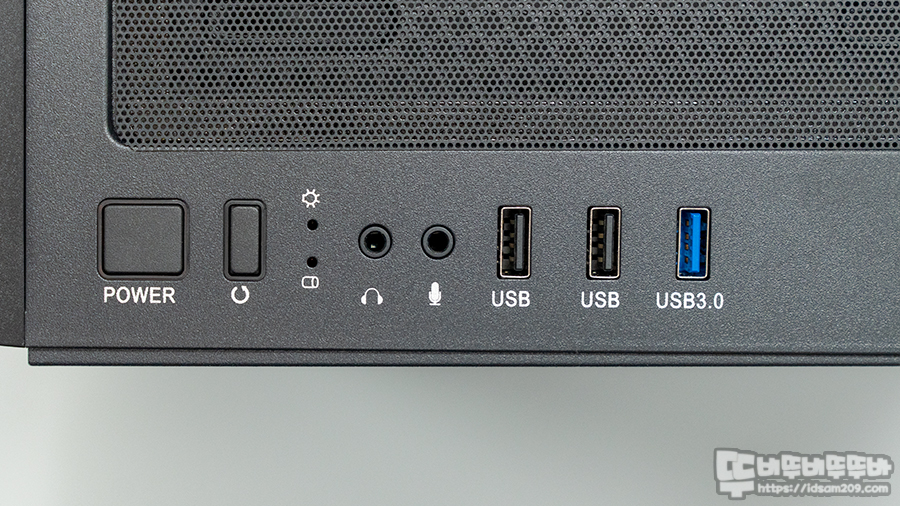샤시 내부를 통하지 않는 I/O 패널은 전원 버튼 / 리셋 버튼 / 전원&HDD LED 인디케이터, USB 2.0 및 3.0 포트로 구성되어 있으며 전면 패널에는 LED On/Off 버튼과 팬 스피드 High/Low 버튼을 제공하여 보통의 미들타워와 차별화된 모습을 보여주고 있고요.