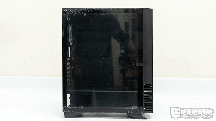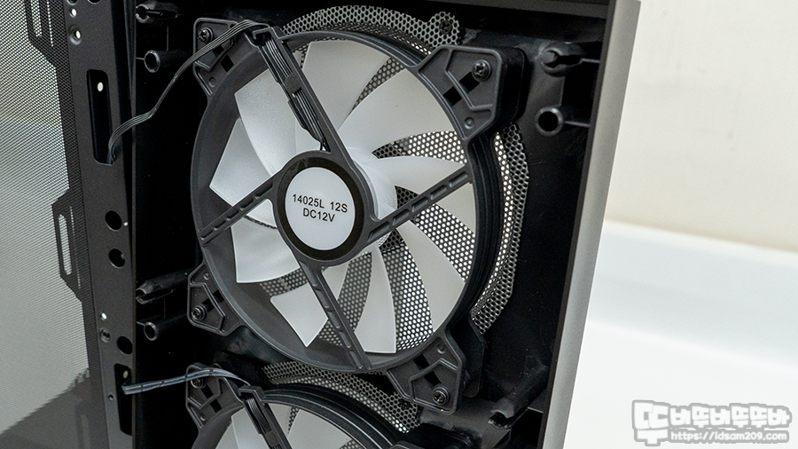 전면의 140mm 쿨링팬은 샤시가 아닌 전면 패널에 부착되는 형태로 되어있어 서두에 설명드린 것과 같이 전면에 수랭쿨러 장착 시 140mm 쿨링 팬 사용 여부에 따라 조금 애매할 수 있으니 참고하시기 바랍니다.