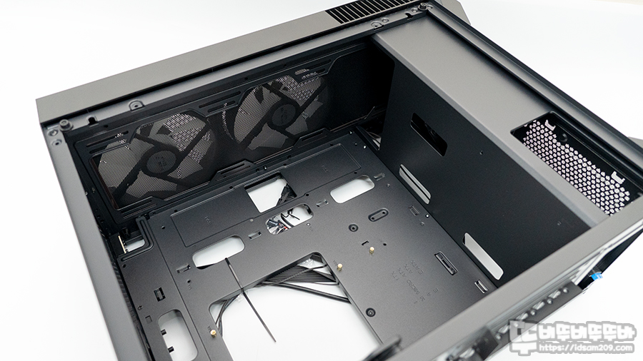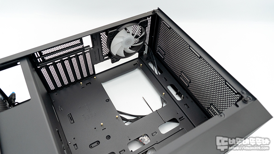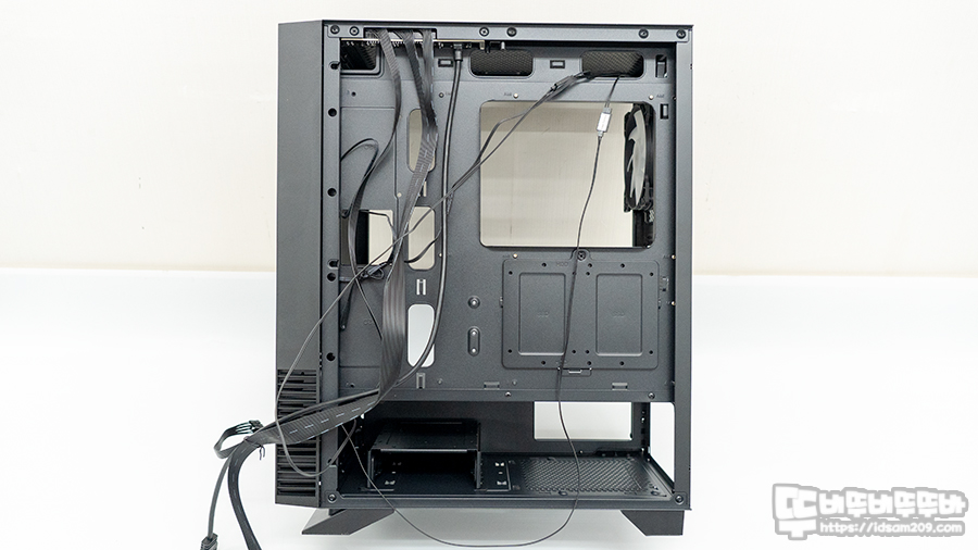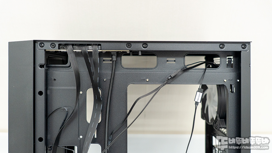 케이스 상단과 중앙에는 케이블을 정리를 위한 정리 홀 그리고 샤시 뒤쪽에 I/O포트 관련 케이블 모습을 확인할 수 있고요.