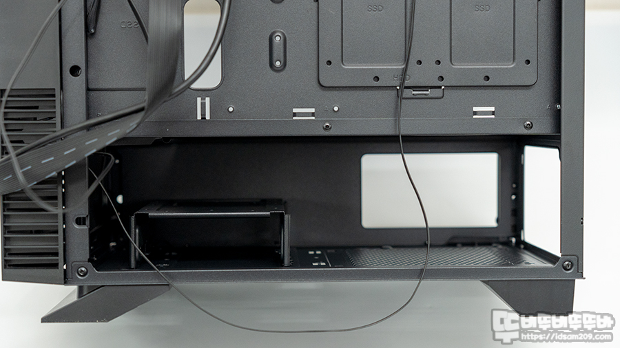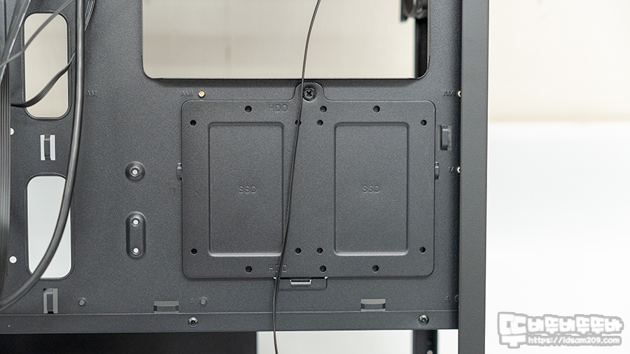 샤시 뒷면에 SSD/HDD 장착 가이드 모습과 하단부의 HDD/SSD 가이드 및 파워서플라이 장착 공간 모습.