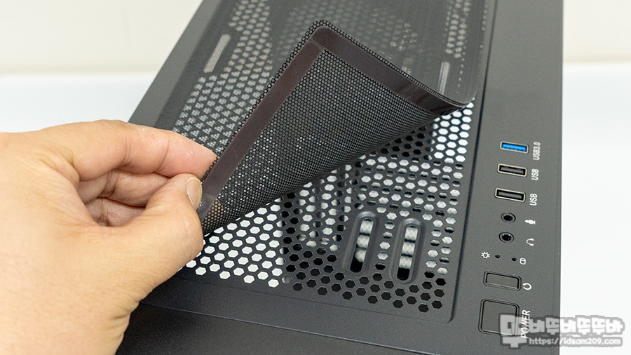케이스 상단에는 120/140mm 쿨링팬 또는 240/280/360mm 라디에이터 장착이 가능하며 고무자석을 이용한 탈부착이 가능한 먼지 필터가 적용되어 있습니다.