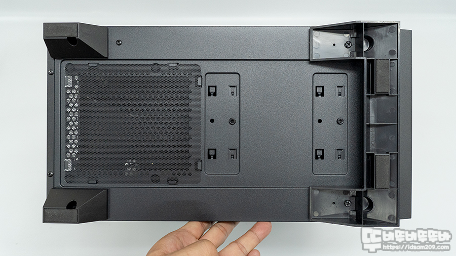 바닥면에는 케이스를 안정적으로 지지하는 다리와 먼지 유입을 방지하는 필터, 위치 이동이 가능한 HDD 가이드 모습을 확인할 수 있습니다.