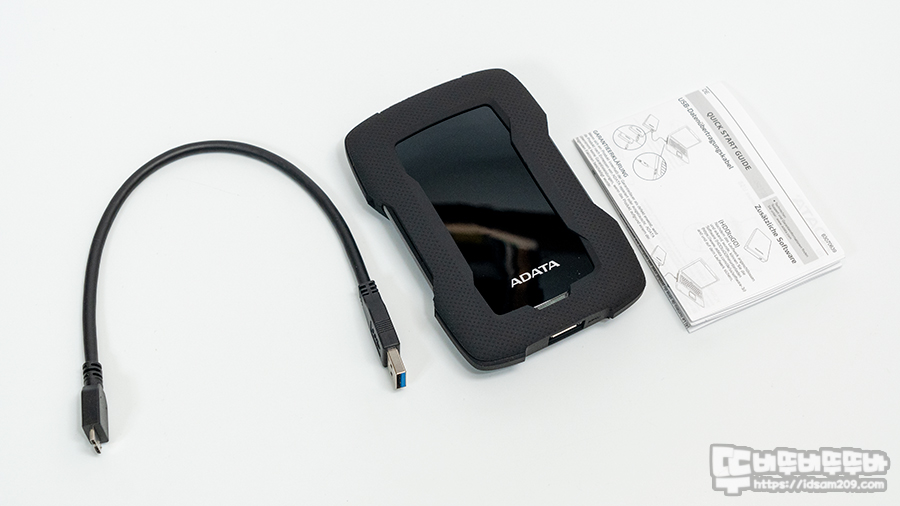 제품은 에이데이타 듀라블 외장하드 HD330 1TB 본체, USB 연결 케이블, 간단 설치 안내서로 구성이 되어있고요.
