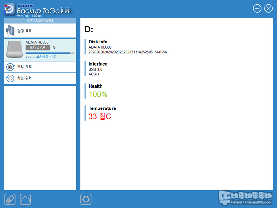 Backup ToGo 프로그램의 초기 메뉴입니다. 드라이버를 선택 시 디스크 정보와 인터페이스 용량 상태 및 온도를 기본으로 보여주며 왼쪽 메뉴의 백업 계획을 통한 데이터 백업 및 타임 워커를 이용한 복원 기능 등 비교적 심플한 기능을 제공하고 있습니다.