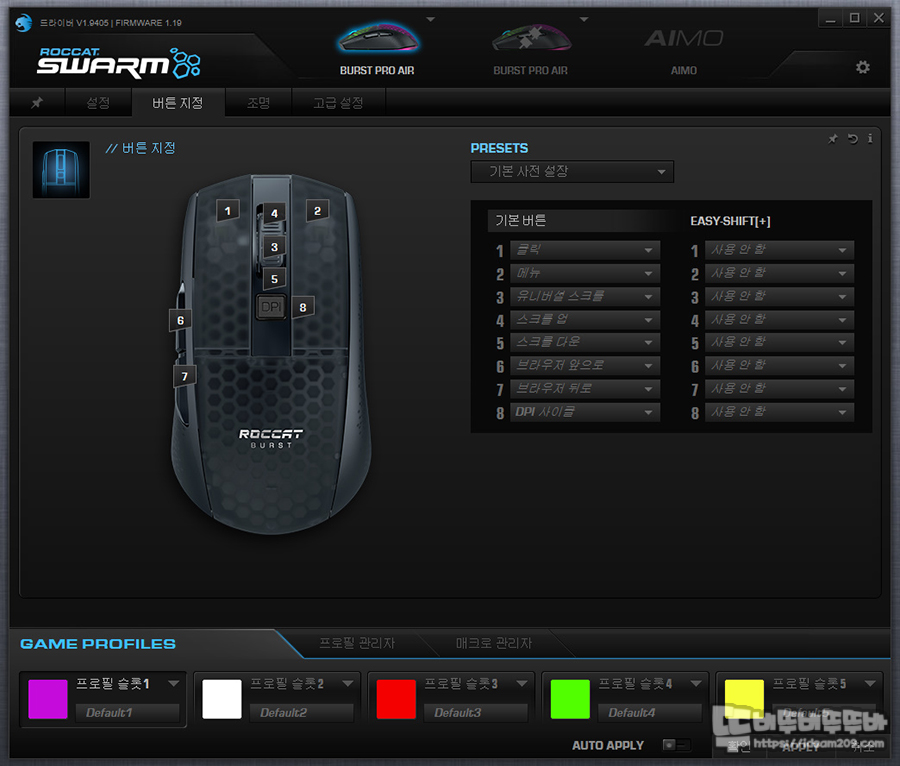 버튼 기능에는 기본 버튼과 Easy-Shift 메뉴로 나뉘어 있고요.