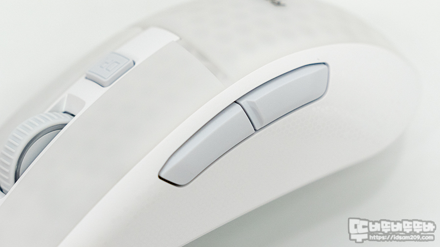 평소 사용하는 마우스 하우징 끝부분이 손바닥 끝에 닿는 클로우 그립으로 사용 시 사이드의 뒤로 가기 버튼 사용이 불편해서 사이드 버튼 중간에 엄지손가락이 위치하는 핑거 그립으로 사용해야 마우스 버튼을 밸런스 있게 사용할 수 있었습니다.