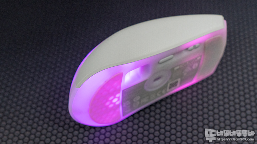 절개형으로 디자인된 메인 버튼과 휠 스크롤, 마우스 하우징에 4개의 LED 구역에 1680만 컬러의 AIMO RGB 라이팅 효과로 블링블링한 효과가 표현되지만 화이트 컬러는 RGB LED 효과가 조금 퍼지는 느낌이 있어 선명한? LED 효과를 원하신다면 블랙 컬러 선택을 추천드립니다.