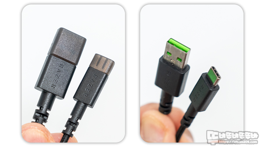 Razer 로고가 각인된 USB-C to A 케이블은 금속 부분을 보호하는 보호 캡과 Razer의 아이덴티티인 그린 컬러가 적용되어 브랜드의 일체감을 주고 있고요.