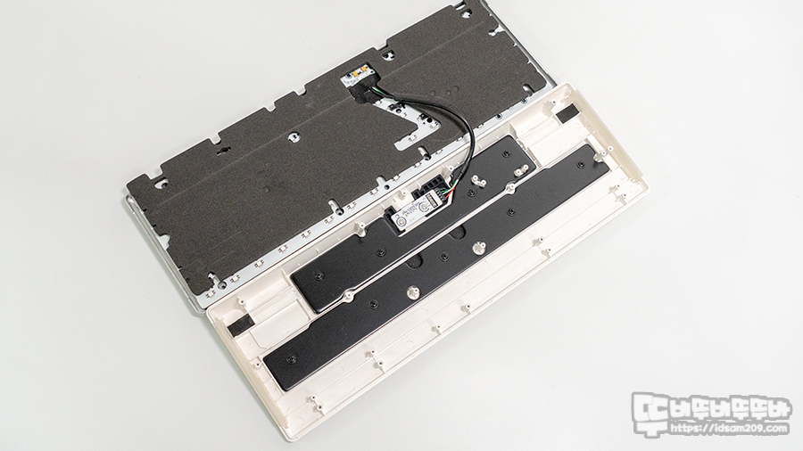 기판 쪽에서 상판을 결합하는 나사를 제거하면 키보강 흡음재 모습과 핫스왑 소켓이 사용된 기판 모습을 확인할 수 있습니다.