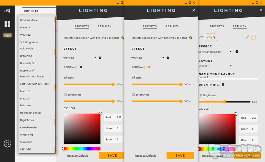 Lighting 메뉴는 오른쪽의 전체적인 효과를 선택하는 Presets 메뉴와 개별 키 선택으로 LED를 표현하는 Per Key 메뉴로 구성되어 있는데요.