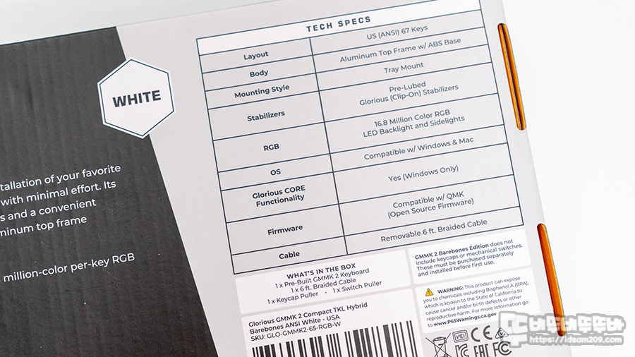 패키지에는 제품의 다양한 정보를 표현 중 상단에 65% 67 키, ASNI(US배열), 알루미늄 탑 프레임과 ABS 베이스 하우징 그리고 GMMK의 포인트인 핫스왑 지원, 1680만 컬러 RGB 라이팅, 글로리어스 코어 프로그램 및 QMK 지원 등을 확인할 수 있고요.