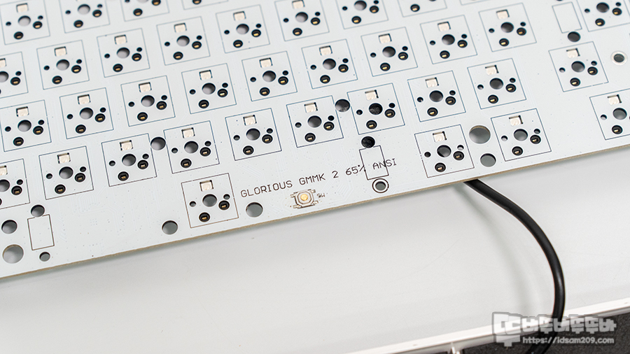 기판에서 특별한 점이라면 SMD 타입의 LED가 기판보다 낮게 장착이 되어있어 다양한 MX 계열의 스위치 호환이 가능하다는 점, 메인보드 고정용 스테빌라이저 홀을 제공하고 있어 글로리어스에서 출시한 GSV2 스테빌라이저나 에버글라이드 V2 무보강 스테빌라이저를 취향에 사용이 가능하며 아무래도 키보드 타이핑 시 소음을 줄이기 위해서는 무보강 스테빌라이저가 좋을 수 있으니 참고하시고요.