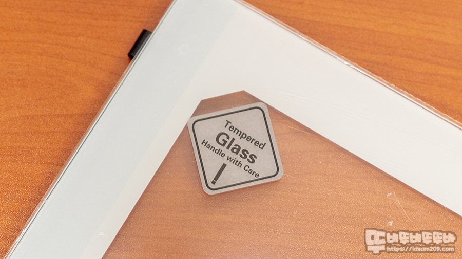 강화유리 패널 앞쪽에 부착된 보호필름에 부착된 강화유리 마크 모습.