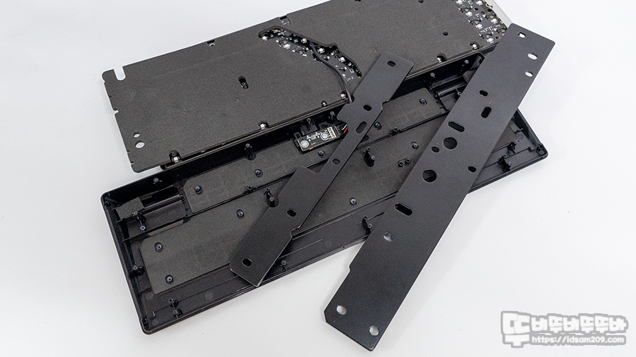 기판 뒤쪽에서 확인 가능한 핫스왑 소켓 그리고 보강판과 기판 사이에 보이는 기보강 모습.