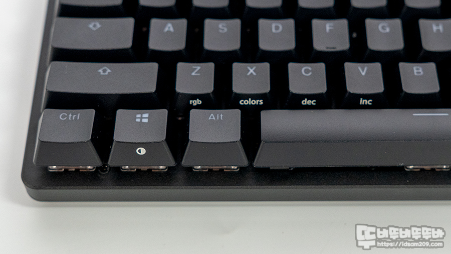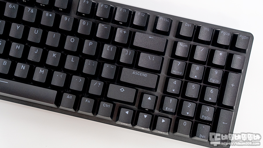 컴팩트 배열이기에 스페이스 바를 기준으로 왼쪽 하단열은 표준 배열의 1.25U 크기의 키캡이 사용되었고 오른쪽 하단열을 1U 키캡과 키캡, 1.75U 크기의 짧은 우 쉬프트를 사용하고 있으니 키캡 놀이 시 이러한 구성을 포함하는 구성으로 구입하시는 게 좋습니다.