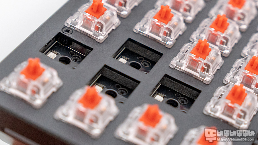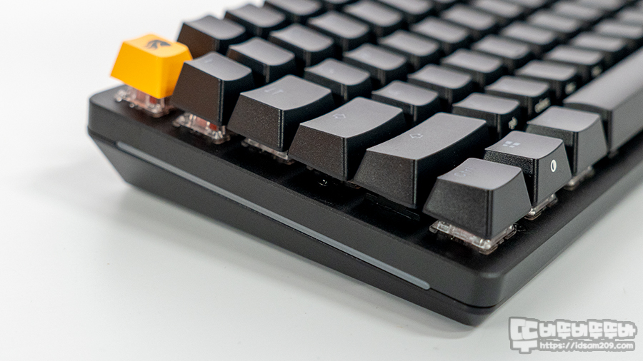 대부분의 SMD 방식의 LED를 사용하는 모든 제품이 동일하기에 단점이라 말할 수 없는데 글로리어스 GMMK 2는 이 부분을 보완하기 위해 키보드 측면에 프레임을 없앤 비키 타입 디자인을 적용하여 살짝 보완하고 있습니다.
