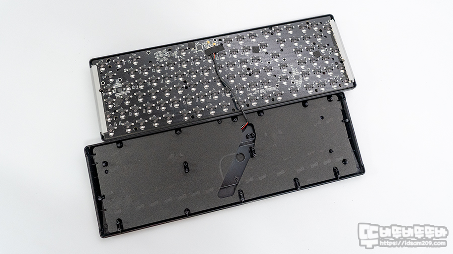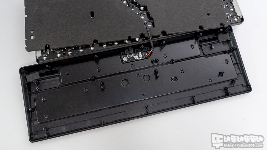 앞전에 리뷰로 소개해드린 65% 베이본(Barebone) 모델과 동일한 구성으로 키보드 상판을 분리 시 하판에 두툼한 PORON(고밀도 폴리우레탄 발포 폼) 흡음제 모습이 눈에 띄고요.