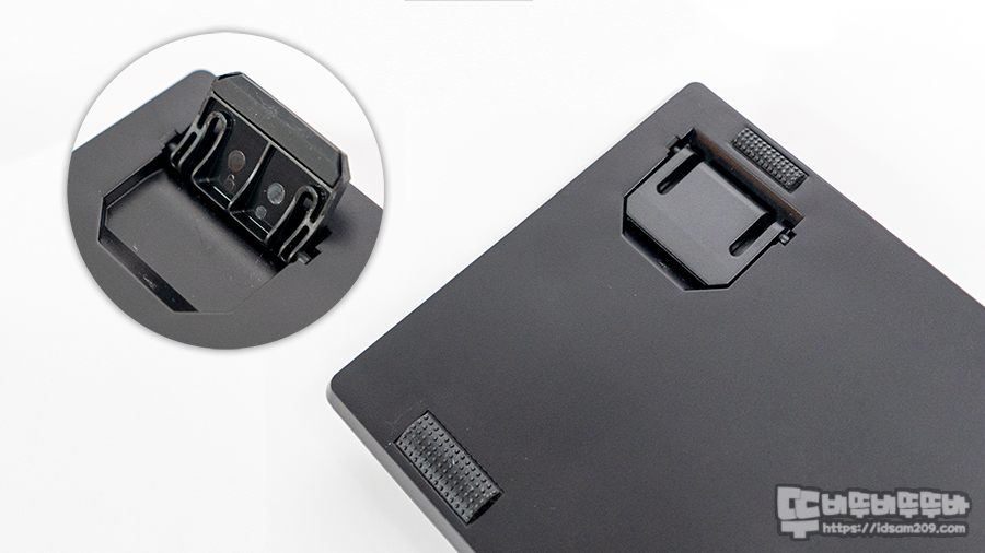키보드 하우징 바닥면 모습입니다. 키보드 상단과 하단부에는 울퉁불퉁하게 돌기가 있는 미끄럼 방지패드는 안정적인 두께감으로 키보드 사용 시 밀림을 방지해주며 높이 조절 다리를 사용 시 다리 안쪽에도 미끄럼 방지 패드를 확인할 수 있네요.