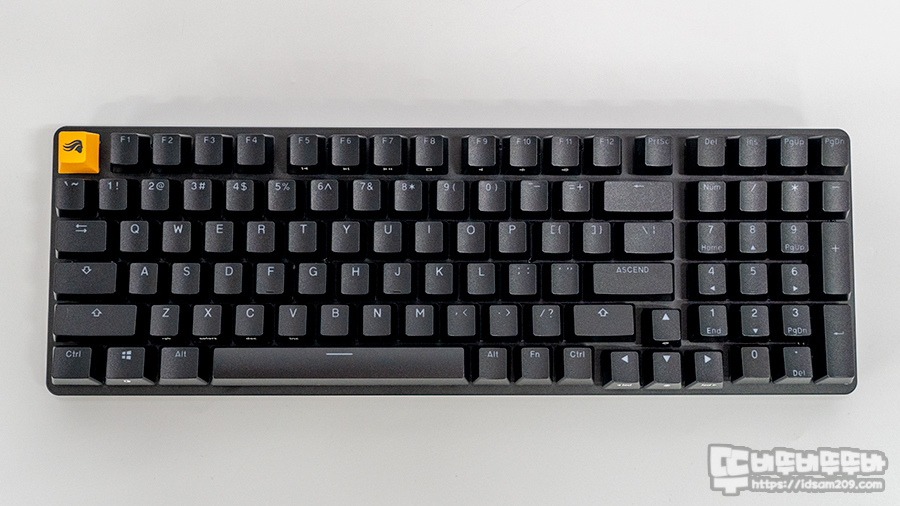 글로리어스의 96% 컴팩트 배열을 상단 F 펑션열과 방향키, 오른쪽 키패드 부분의 간격을 소폭 유지하는 디자인으로 책상의 공간을 덜 차지하게 디자인된 게 특징입니다.