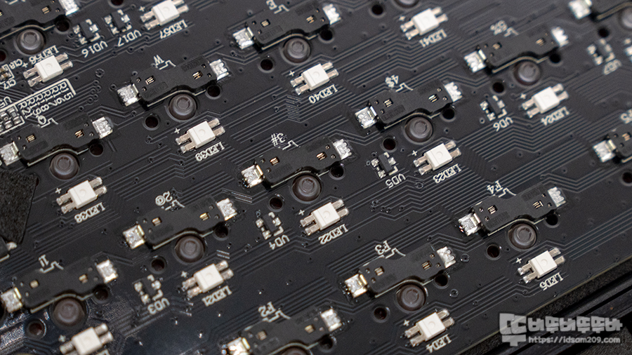 기판에 LED가 부착되는 SMD 방식 LED 빛이 스위치를 관통하여 발산되기에 광량이 많이 약하고 반대로 스위치 위로 장착하는 DIP 타입 방식에 키캡 및에 LED가 위치하여 광량이 강한 편입니다.