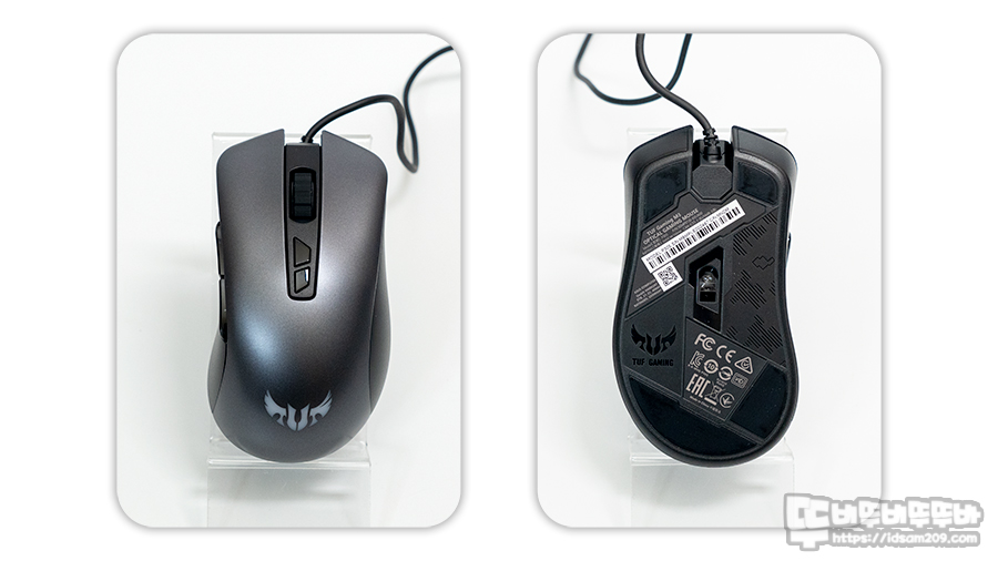 보통 대칭형 마우스는 마우스 왼쪽 버튼의 살짝 높게 디자인되어 검지를 살짝 들고 사용해야 하는 불편함이 있었지만 ASUS TUF Gaming M3 마우스는 대칭형 마우스처럼 손가락을 편안하게 올려놓고 사용하는 형태라 그립감과 클릭감을 생각한 인체공학 디자인이 적용된 것을 알 수 있었고요.