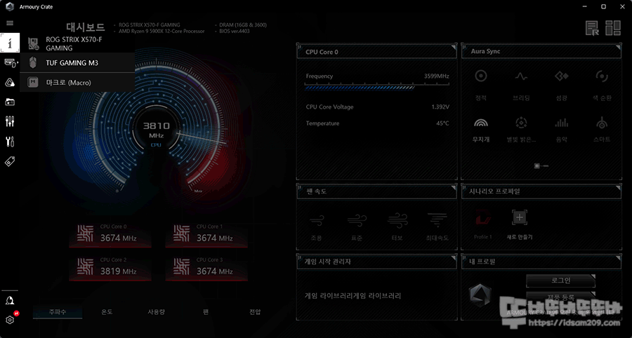 ASUS 제품을 사용하게 되면 편한 부분이 Armoury Crate에 주변기기 소프트웨어가 추가되어 편리하게 사용할 수 있다는 점입니다.