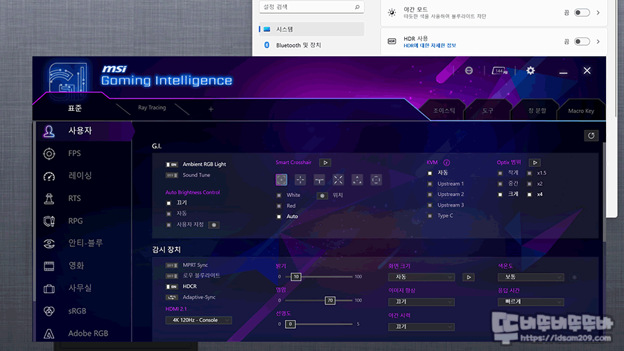MSI 옵틱스 MPG321UR-QD 모니터는 플리커 프리, 블루라이트 차단, 눈부심 차단을 위한 논글래어 사용 1ms MPRT 응답속도 이외에도 144Hz 주사율과 120Hz 콘솔 모드, 3대의 PC를 연결하여 하나의 마우스와 키보드로 사용할 수 있는 KVM, 오버스럽지 않은 HDR 600, 모니터에서 구현되는 크로스 헤어 및 옵틱스 스코프 기능 그리고 퀀텀 닷 디스플레이에 4K 해상도를 지원하는 32인치 모니터 중 동급 최강의 모습을 보여주고 있습니다.