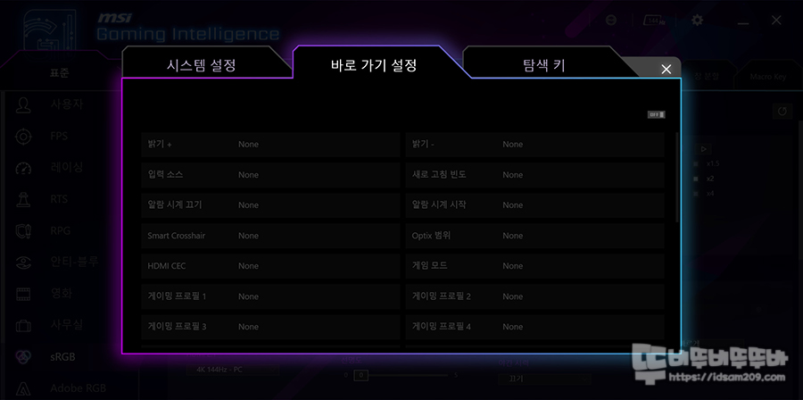 옆부분에 있는 톱니바퀴 설정 메뉴를 선택 시 시스템 설정 바로 가기 설정, 탐색 키 등의 설정이 가능합니다.