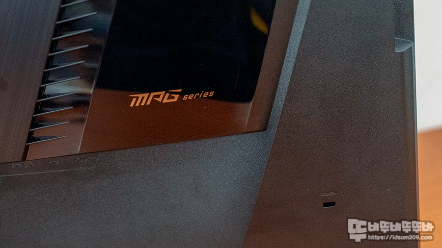 모니터 중앙에는 MSI 미스틱 LED 라이팅 표현이 가능한 LED 라이트 바 그리고 우측 아래쪽에는 켄싱턴 락 그리고 모니터 측면에는 USB 포트 2개와 마이크 / 스테레오 단자 모습을 확인할 수 있습니다.