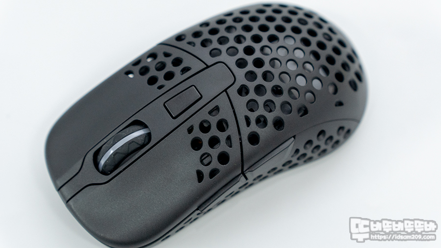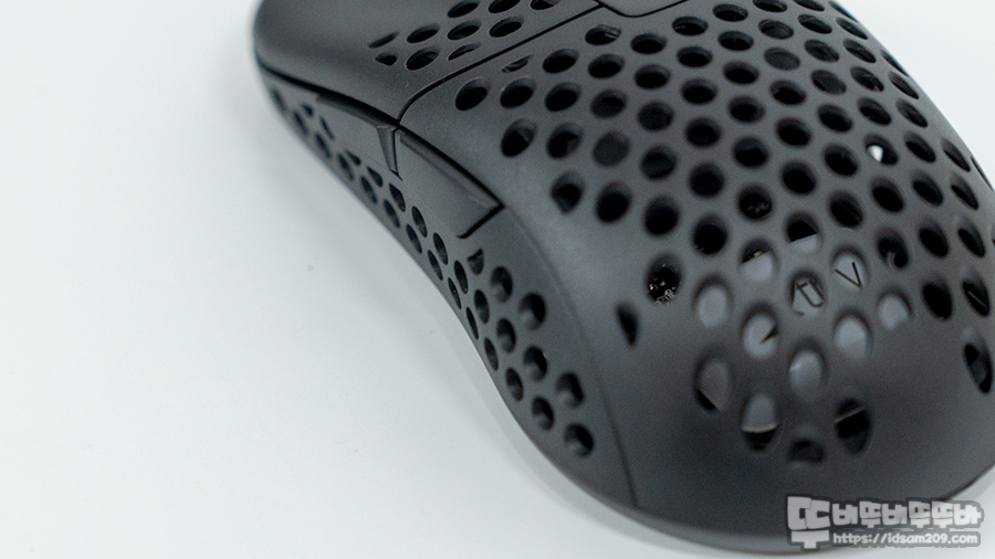 대칭형 디자인이며 사이드 버튼이 마우스 왼쪽에 위치한 전형적인 오른손 전용 마우스임을 확인할 수 있으며 버튼 끝부분이 일반적인 마우스보다 낮게 설계되었으며 약간의 클릭 압이 있는 Kailh GM 8.0 마이크로 스위치를 사용했음에도 연속 클릭 시 손가락이 편안한 편입니다.