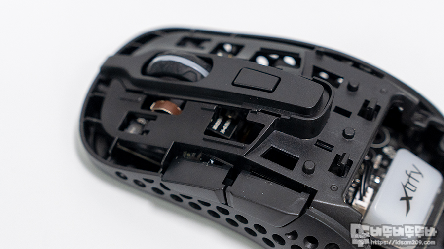 버튼부 커버를 분리 시 Kailh GM 8.0 마이크로 스위치 모습과 내부 부품 모습을 살짝 엿볼 수 있습니다.