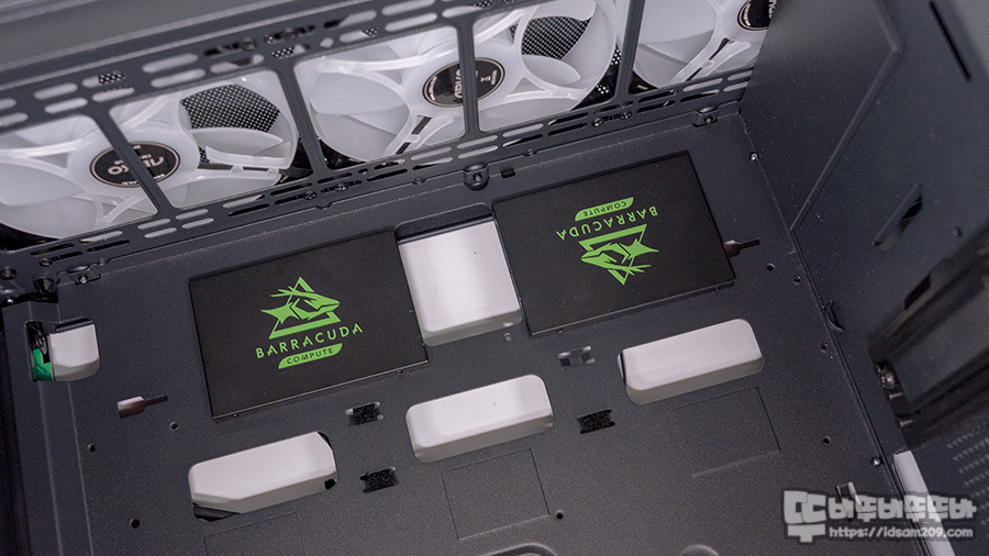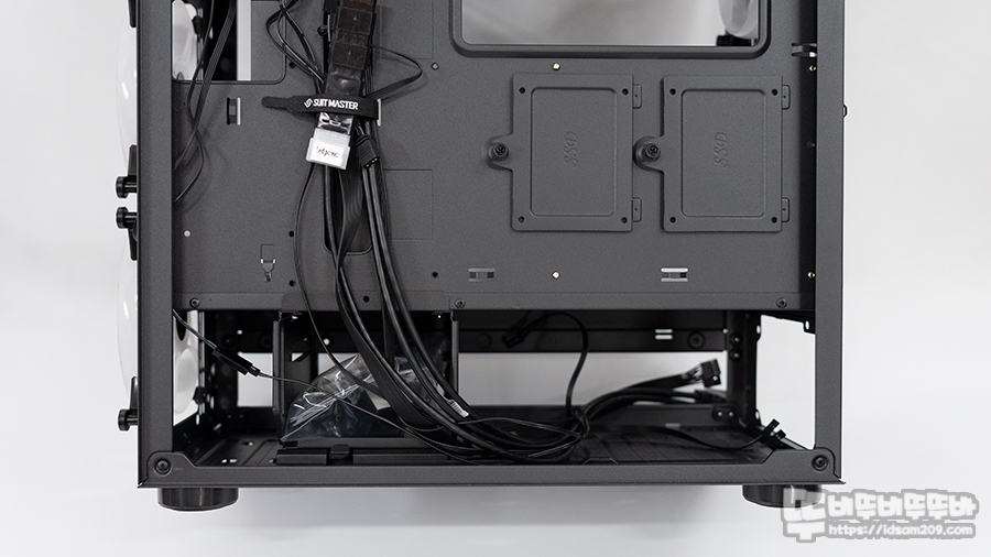 샤시 뒤쪽에는 SSD를 장착할 수 있는 전용 브라켓 2개와 하단에 2개 HDD 장착이 가능한 전용 베이 모습, 베이 뒤쪽으로는 225mm 공간으로 파워서플라이와 케이블을 수납할 수 있는 공간을 제공합니다.