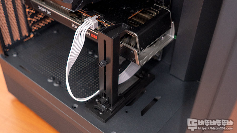 나사 고정 방식이 아닌 앞쪽에 걸쇠 부분을 눌러 앞뒤 움직임 가능한 원터치 방식, 손나사를 이용한 위/아래 높이 조절이 가능한 그래픽 카드 지지대는 간편한 분리, 장착 그리고 고정력이 좋아서 안정적으로 사용할 수 있었습니다.