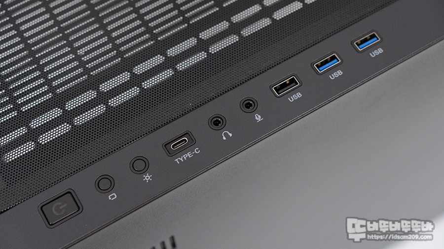 전원 버튼 (LED 인디케이터 내장) / 리셋 스위치 / LED 컨트롤 버튼 / USB-C 단자 / HD-Audio / USB 2.0 포트 / USB 3.0 포트로 구성되어 사용하기 편리한 편입니다.
