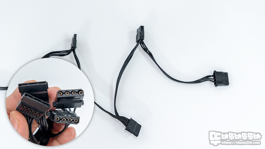 SATA 커넥트 2개, IDE 커넥트 2개로 구성된 케이블은 400+150+150+150±20mm 길이로 구성되어 기본적인 파워 서플라이 케이블 모습을 보여주고 있습니다.