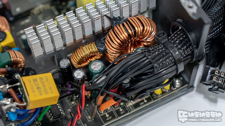 파워 서플라이 중앙에는 정전압 IC의 열기를 해소하는 알루미늄 히트싱크와 DC 전류를 세분화는 스위칭 트랜스 모습.