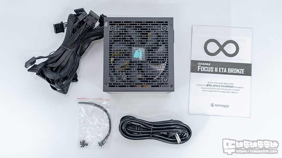 제품은 마이크로닉스 COOLMAX FOCUS II 800W ETA BRONZE 파워서플라이 본체, 케이블 타이, 케이스 샤시 고정 나사, AC 코드, 간단 사용 설명서로 구성되어 있습니다.