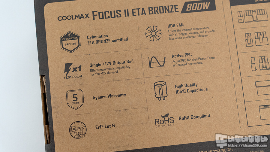 기존에는 보통 80 Plus 인증 기관의 인증을 표기하였다면 COOLMAX FOCUS II의 경우 사이버네틱스의 인증을 표기하고 있는 게 특징인데요.