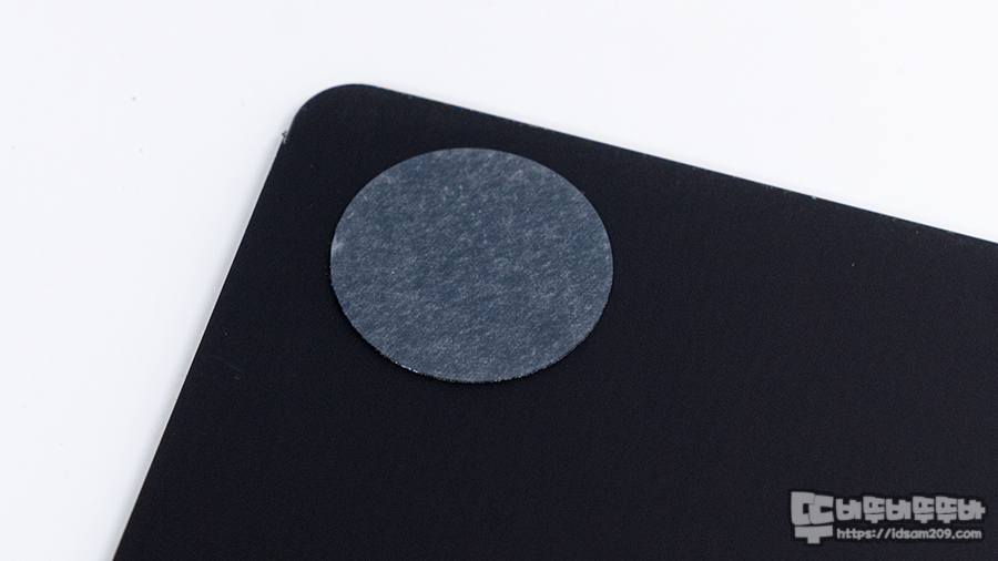 마우스 바닥면은 강화유리에 뭔가 아주 얇은 시트지 같은 것이 부착된 느낌이며 모서리 끝부분에 미끄럼 방지 패드를 부착되어 있어 마우스 패드가 밀리지 않고 사용할 수 있습니다.